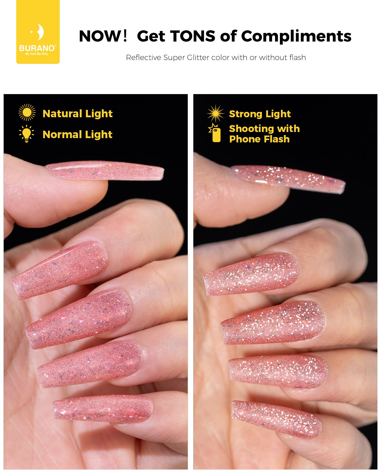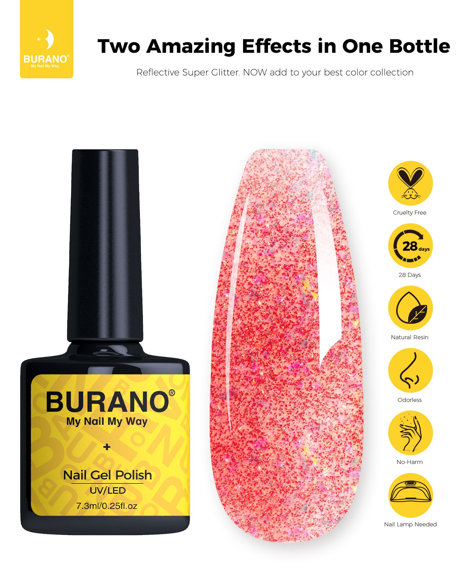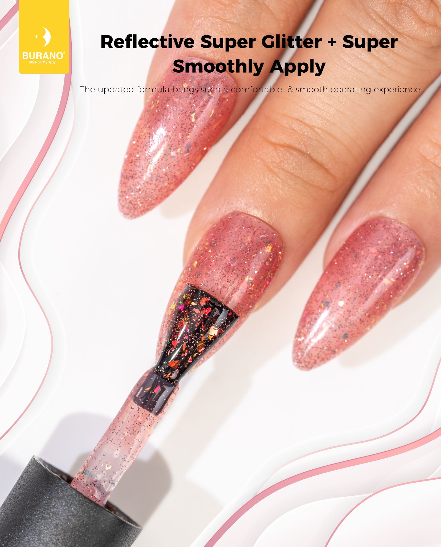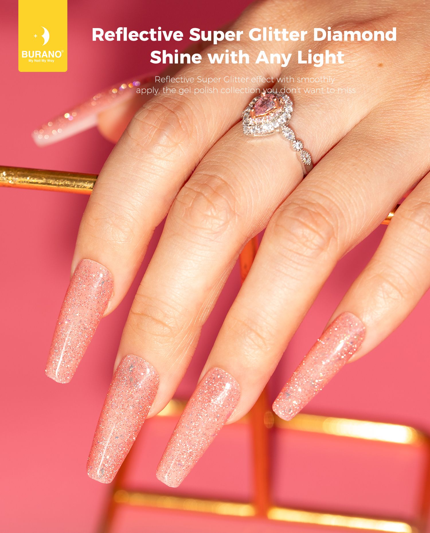 BURANO Holographic Gel Polish, Reflective Glitter Gel Polish 7.3ml UV LED Pink Glitter Gel Nail Polish for Home DIY, Diamond Gel Nail Polish Curing Required (YH27)