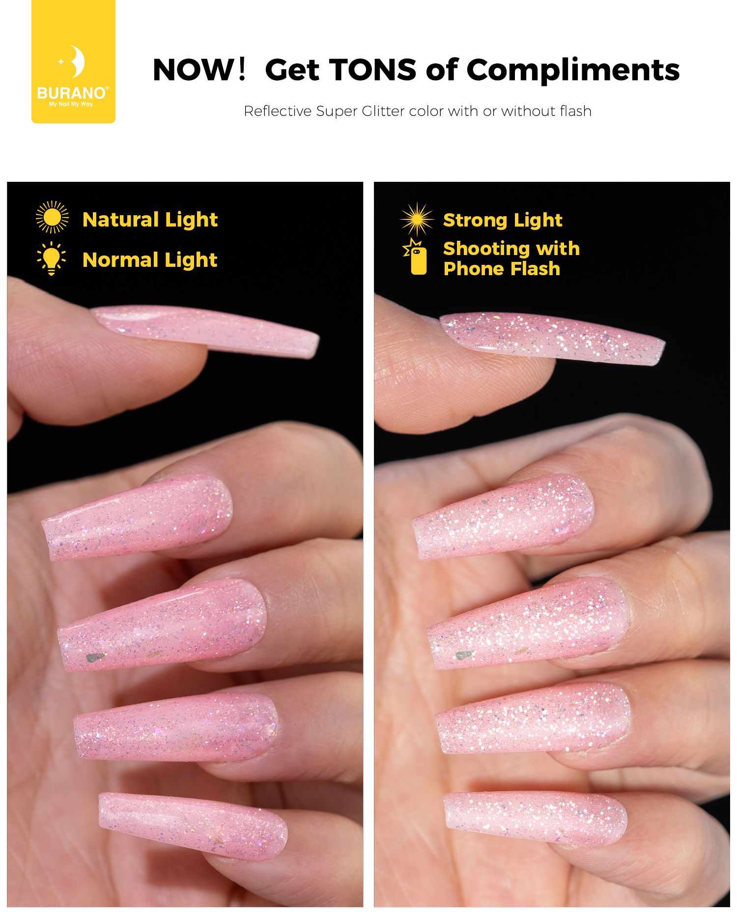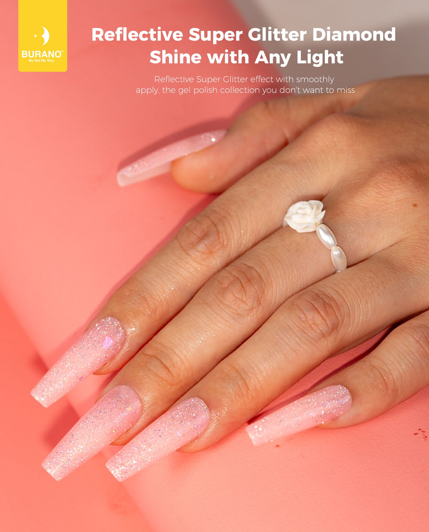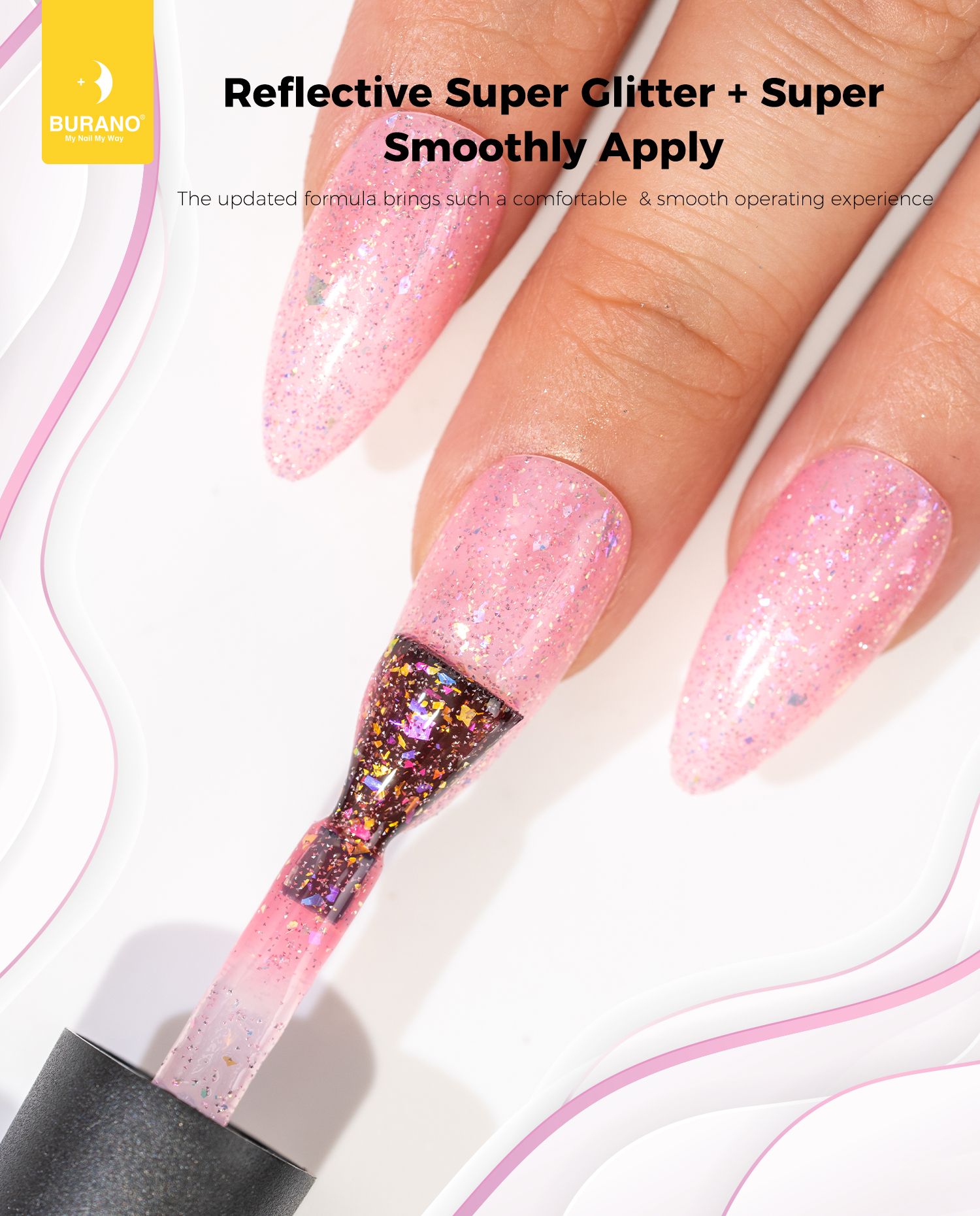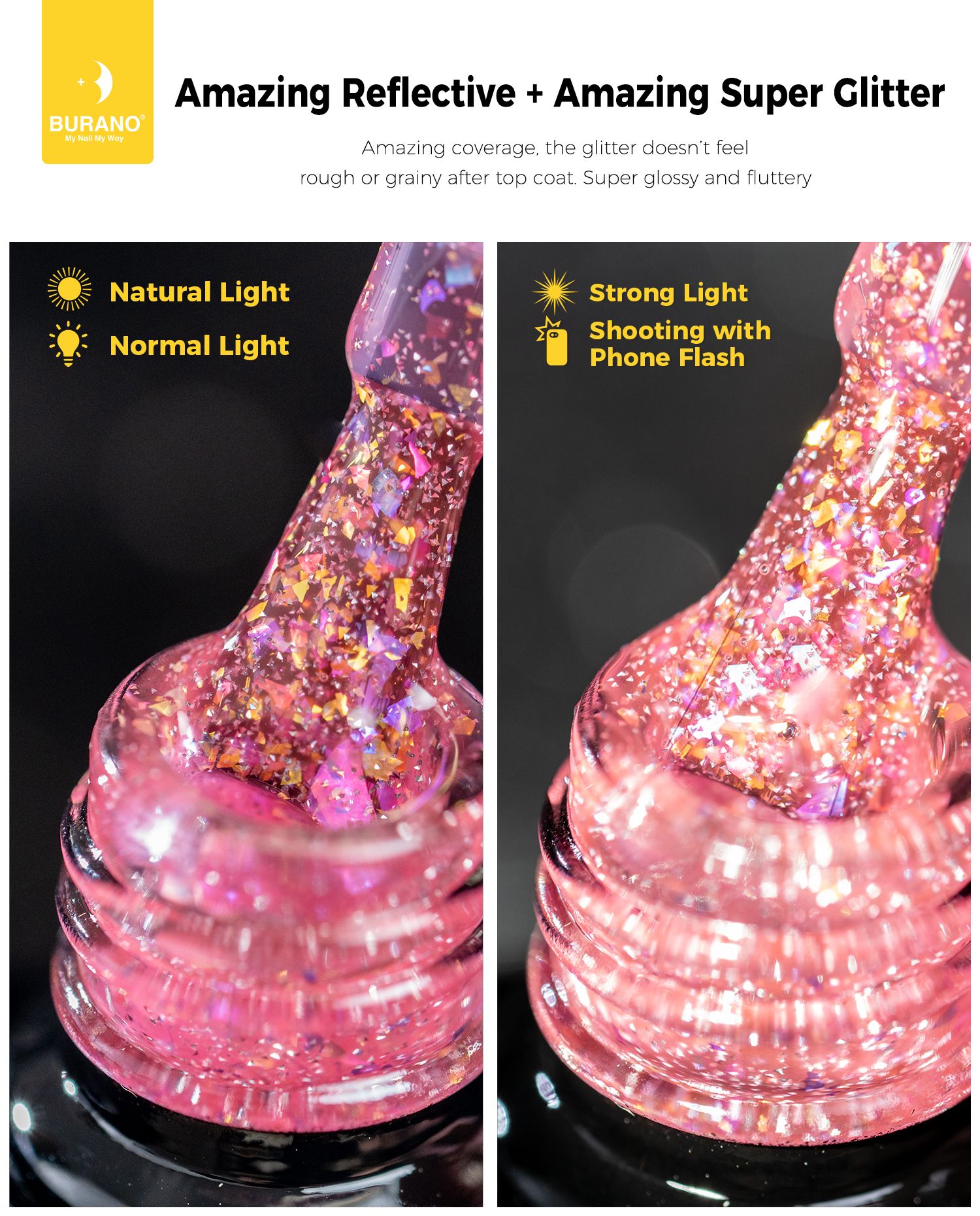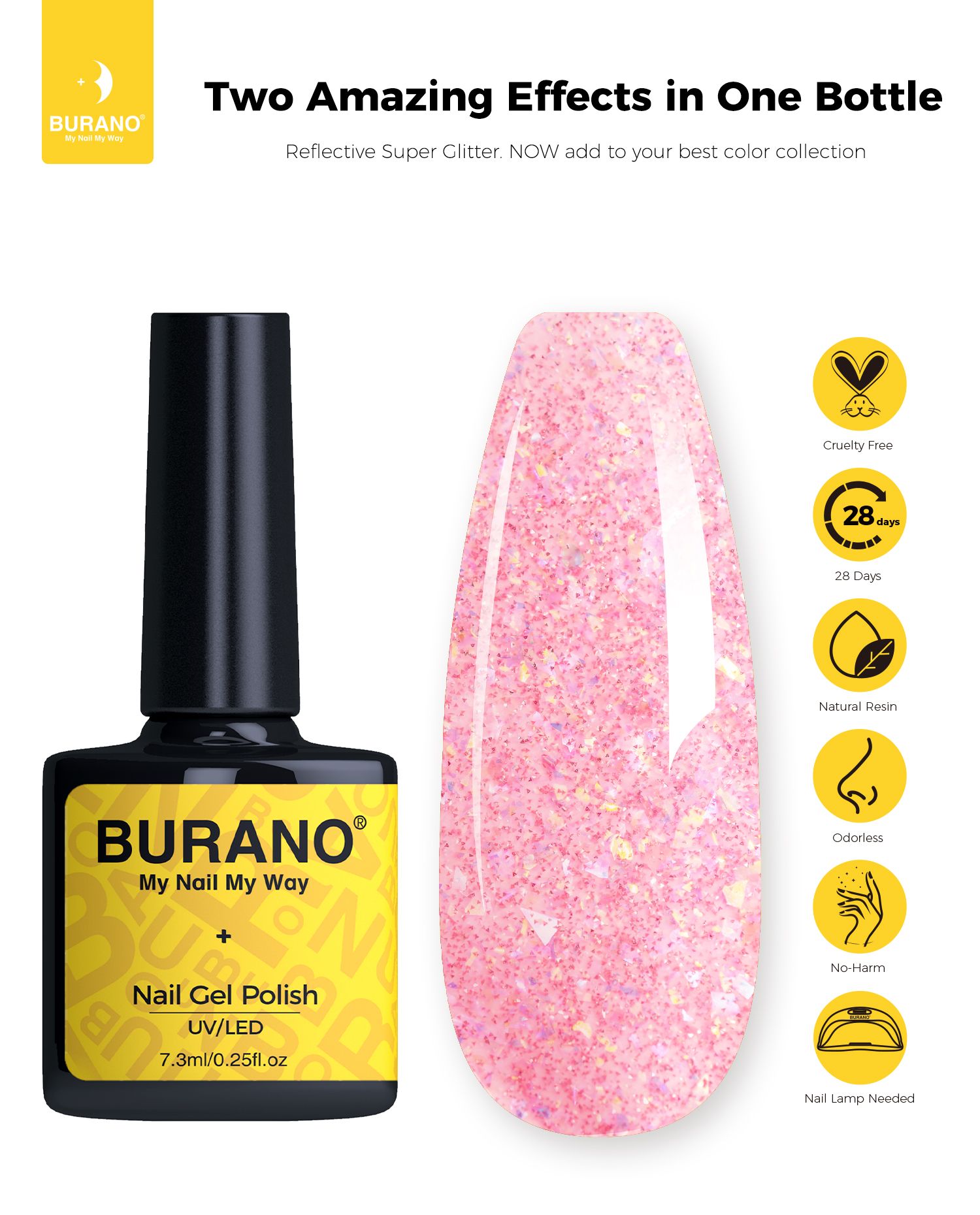 BURANO Holographic Gel Polish, Reflective Glitter Gel Polish 7.3ml UV LED Pink Glitter Gel Nail Polish for Home DIY, Diamond Gel Nail Polish Curing Required (YH34)