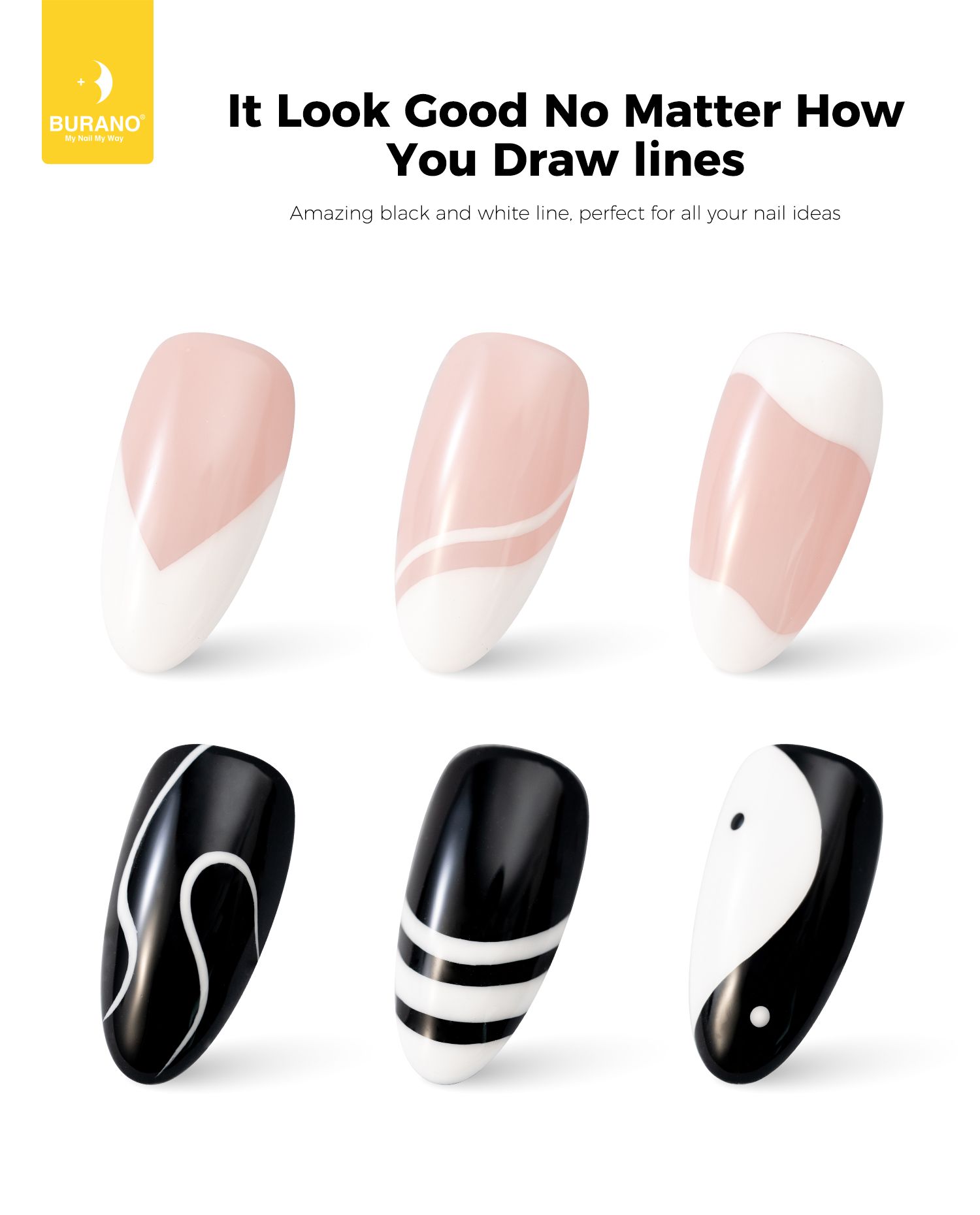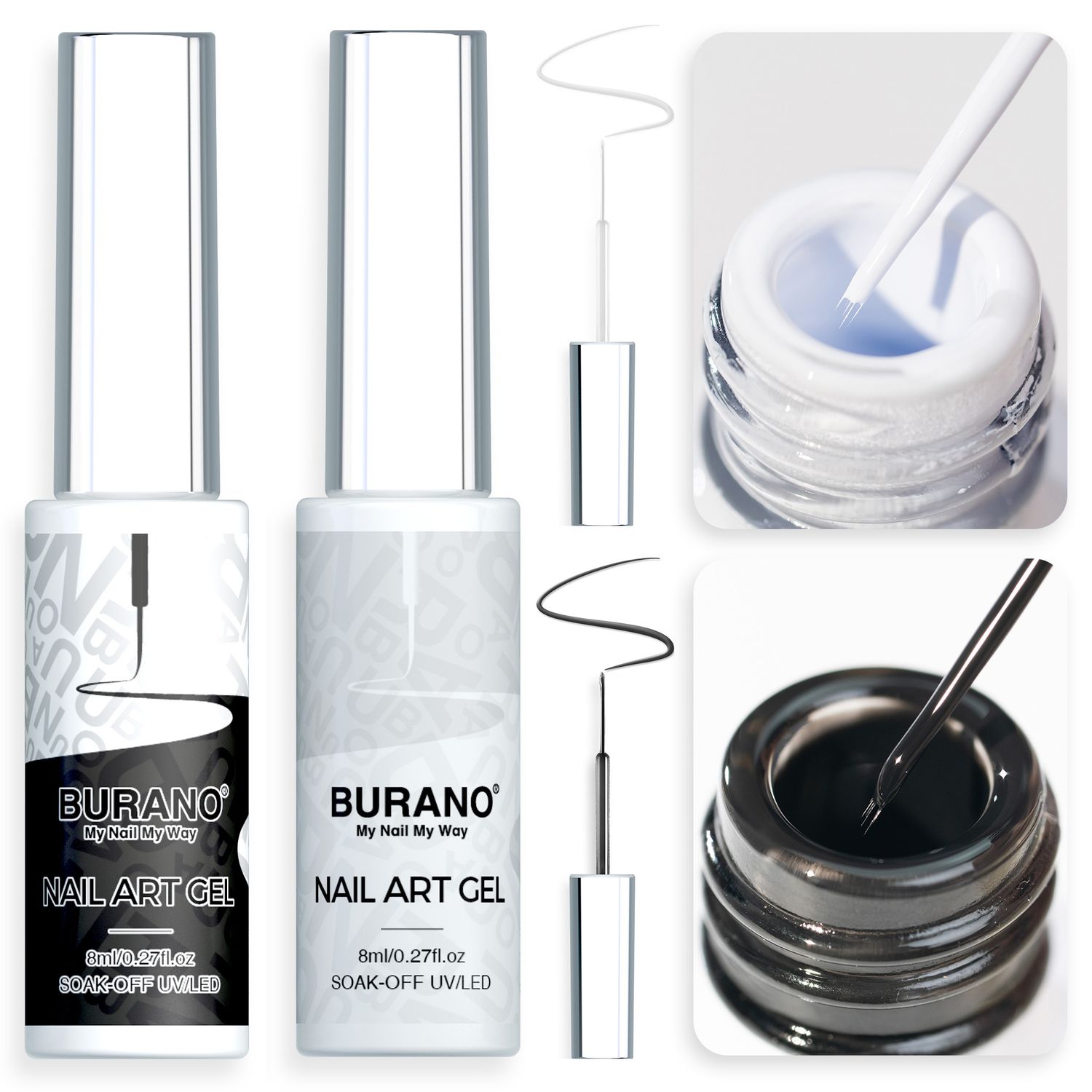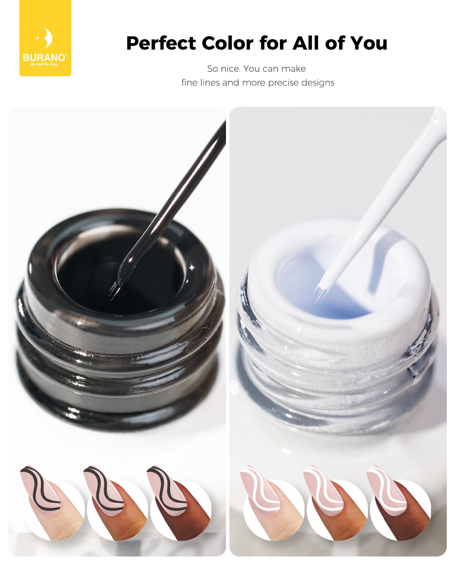BURANO Gel Nail Polish Liner Nail Art Polish, Black White Painted Gel Nail Design Polish 2 Bottle 8ml, Build in Thin Nail Brush Gel Nail Polish Curing Required