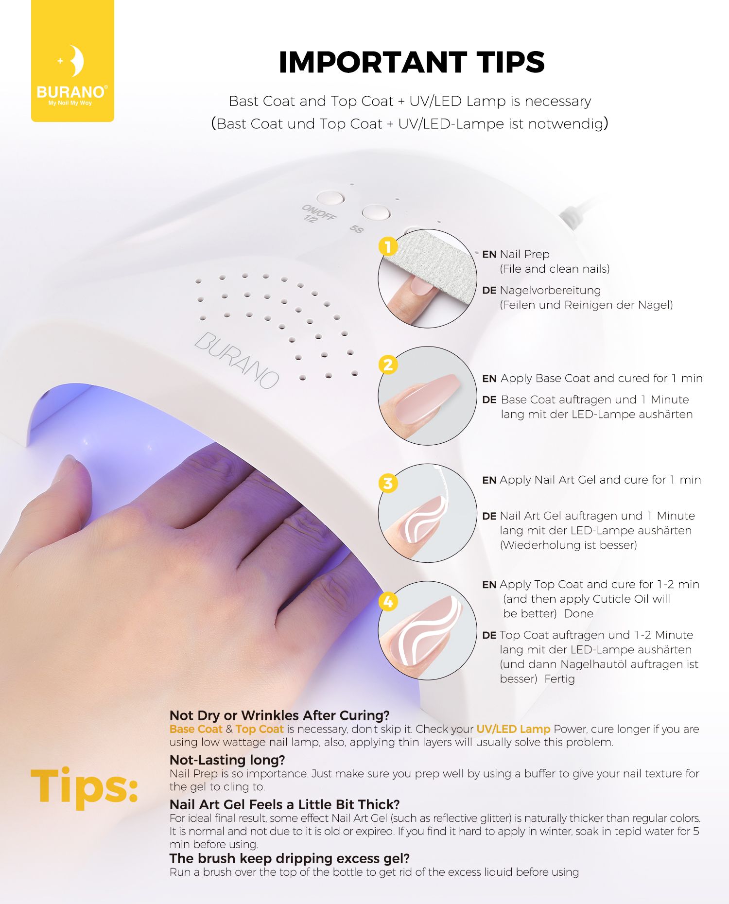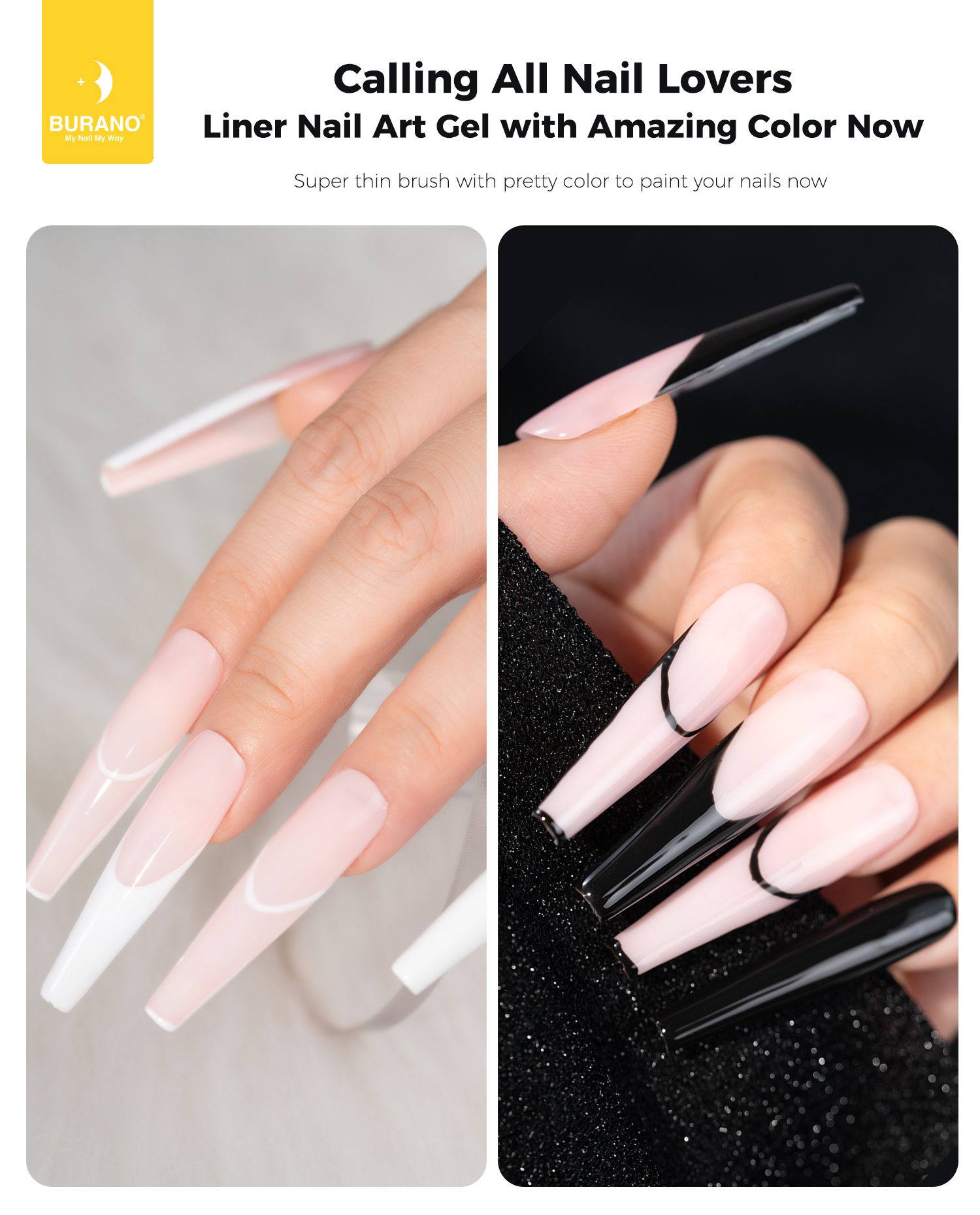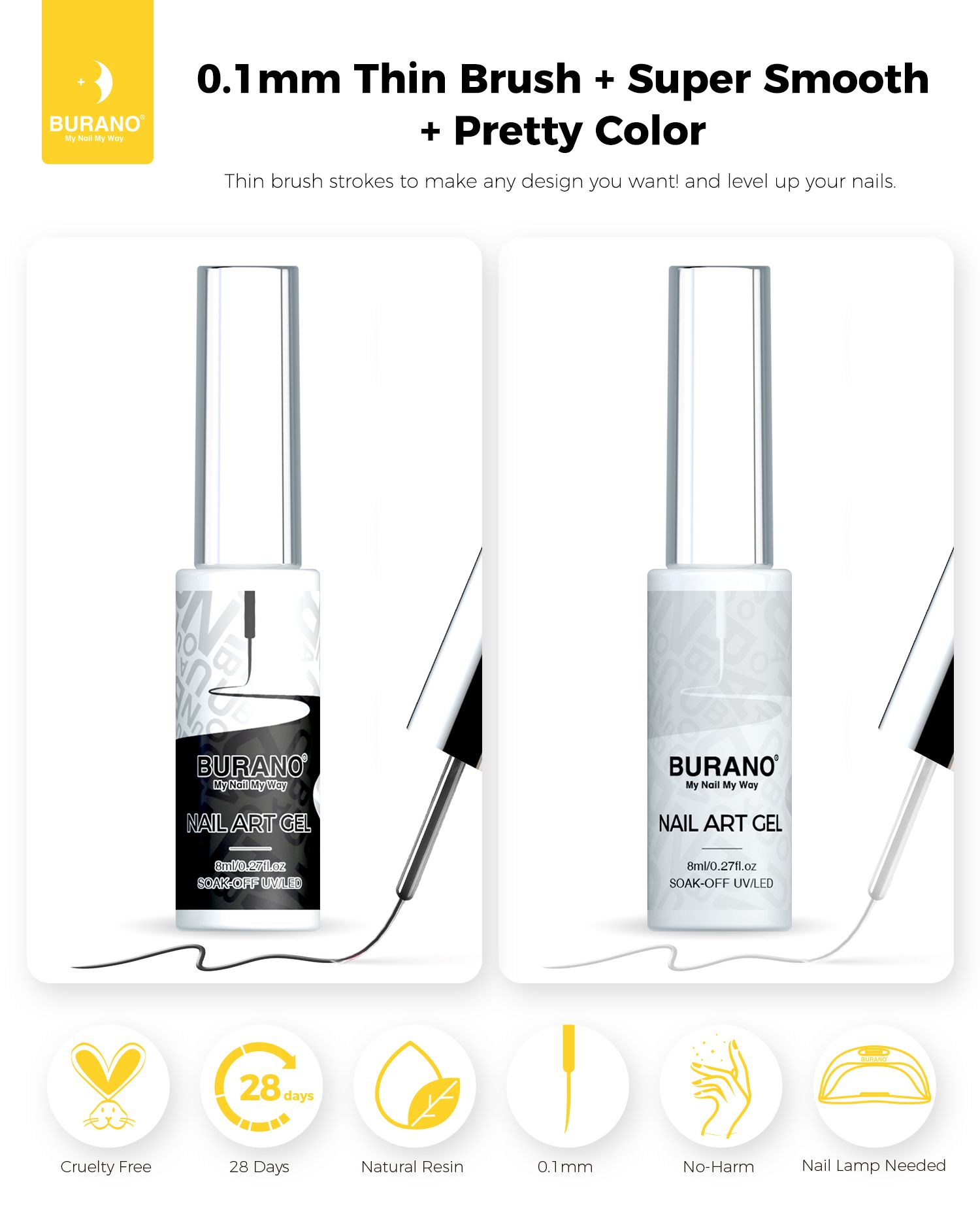 BURANO Gel Nail Polish Liner Nail Art Polish, Black White Painted Gel Nail Design Polish 2 Bottle 8ml, Build in Thin Nail Brush Gel Nail Polish Curing Required