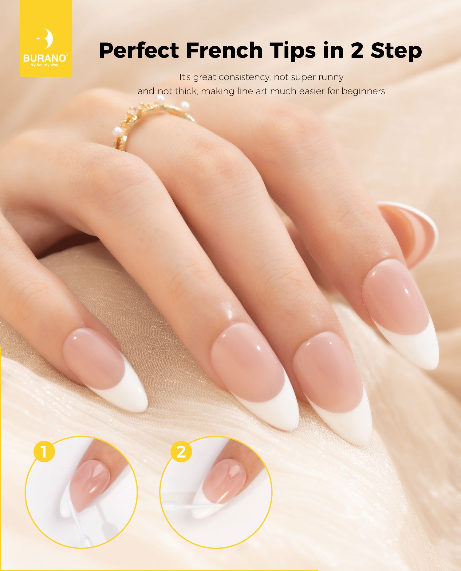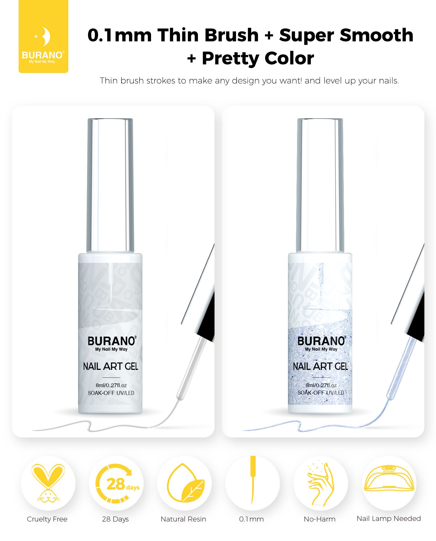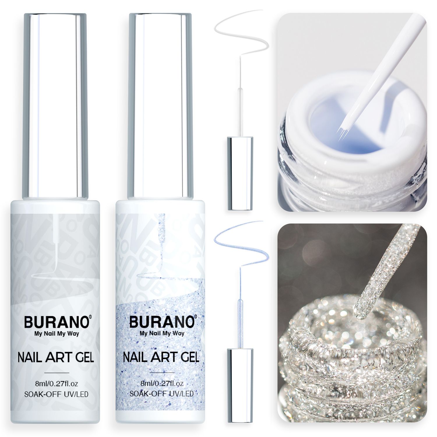 BURANO Gel Nail Polish Liner Nail Art Polish, Silver Gold Painted Gel Nail Design Polish 2 Bottle 8ml, Build in Thin Nail Brush Gel Nail Polish Curing Required LX12 LX13