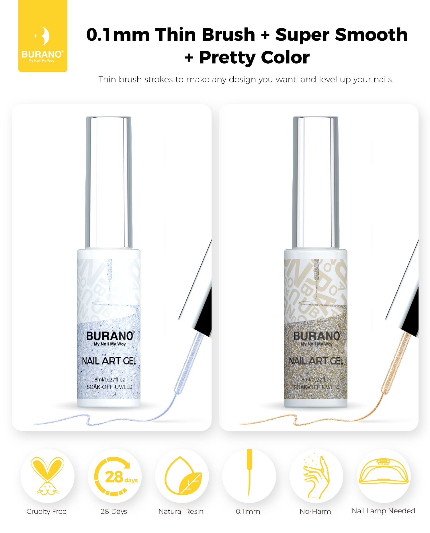 BURANO Holographic Gel Nail Polish Liner Nail Art Polish, Silver Gold Reflective Glitter Painted Gel Nail Design Polish 2 Bottle 8ml, Build in Thin Nail Brush Gel Nail Polish Curing Required