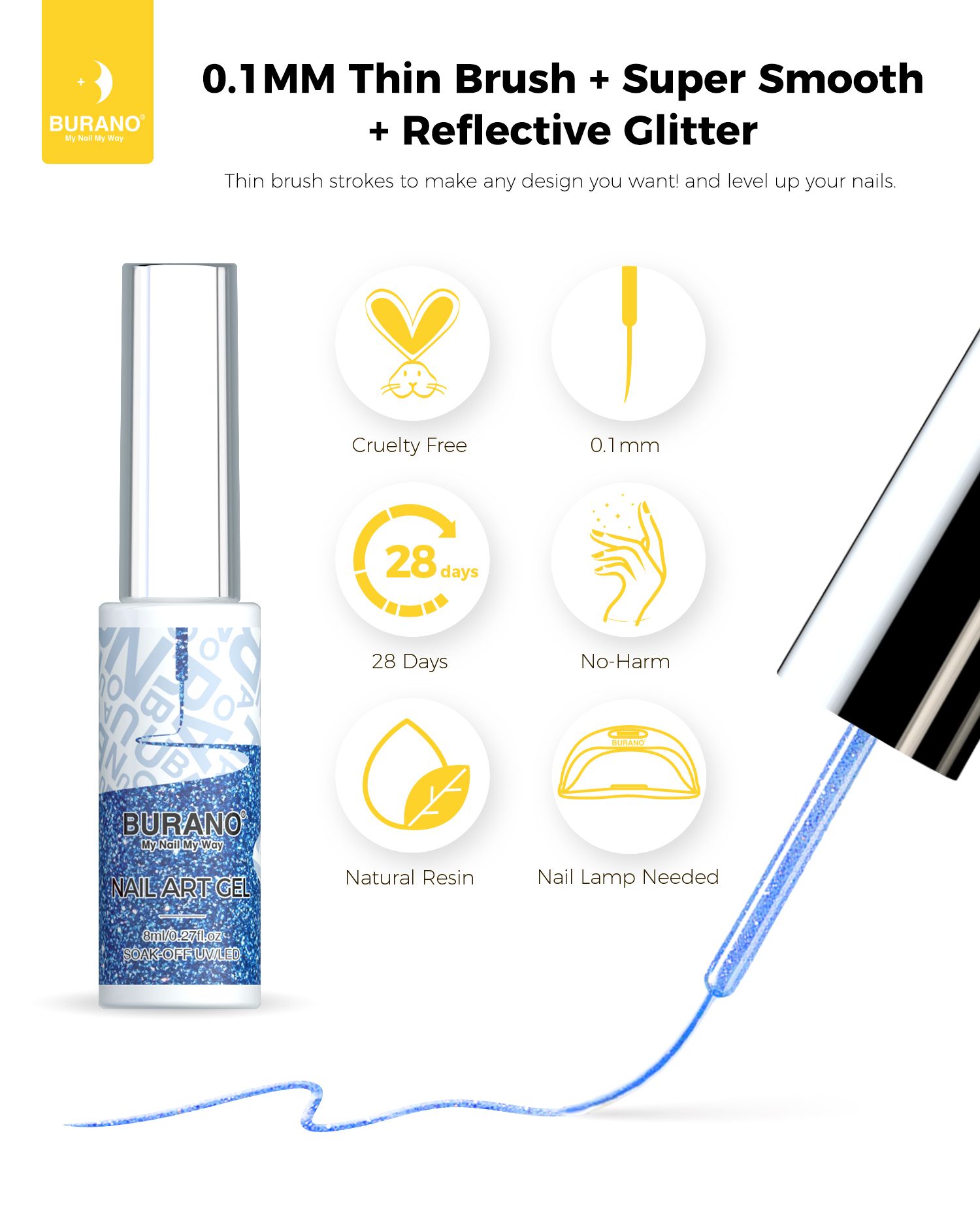 BURANO Holographic Gel Nail Polish Liner Nail Art Polish, Reflective Glitter Painted Gel Nail Design Polish 1 Bottle, Build in Thin Nail Brush Chrome Gel Curing Required 8ml (LX19)…