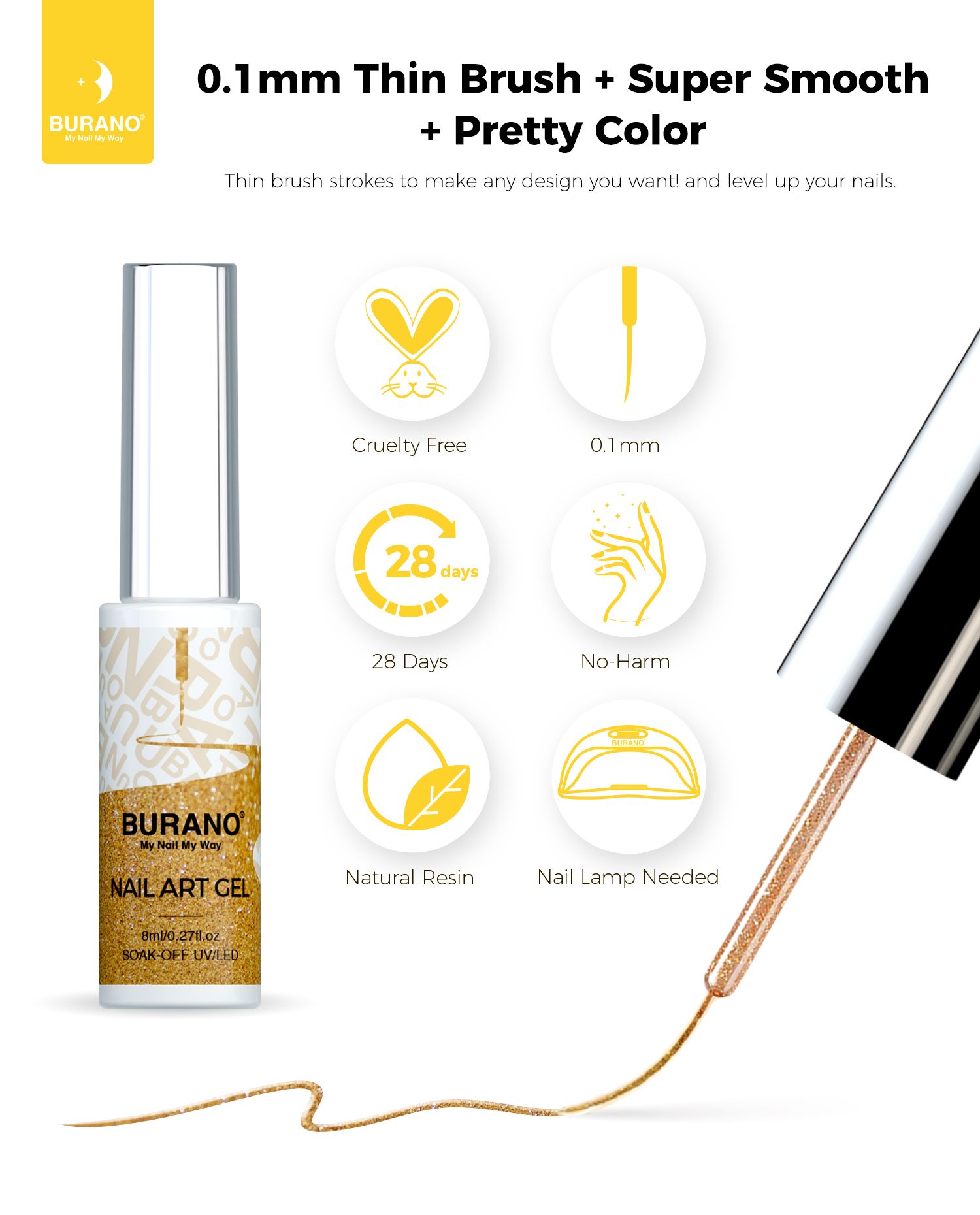 BURANO Gel Nail Polish Liner Nail Art Polish, Black White Purple Red Pink Painted Gel Nail Design Polish 1 Bottle, Build in Thin Nail Brush Chrome Gel Nail Polish Curing Required 8ml (LX2)…