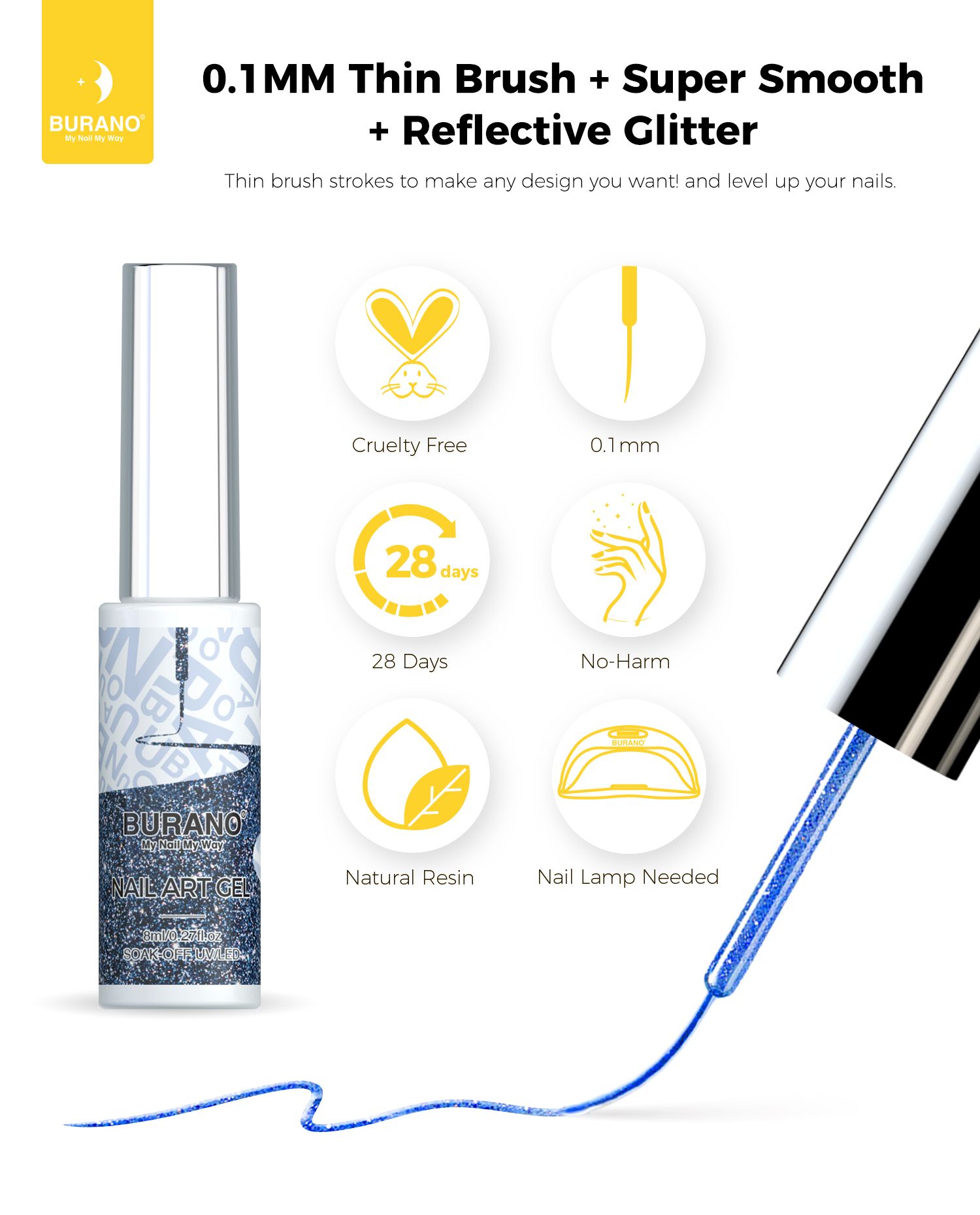 BURANO Holographic Gel Nail Polish Liner Nail Art Polish, Reflective Glitter Painted Gel Nail Design Polish 1 Bottle, Build in Thin Nail Brush Chrome Gel Curing Required 8ml (LX22)…