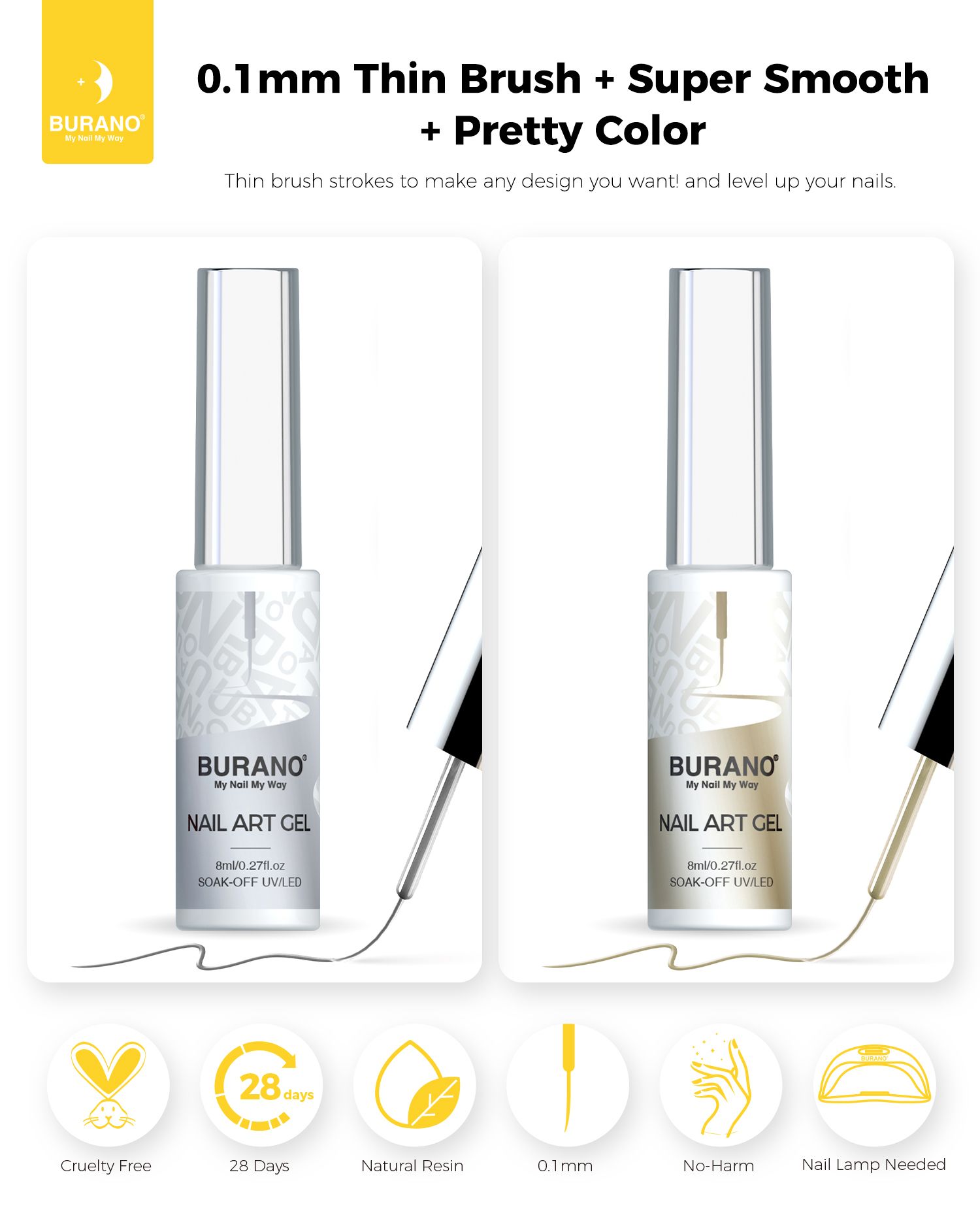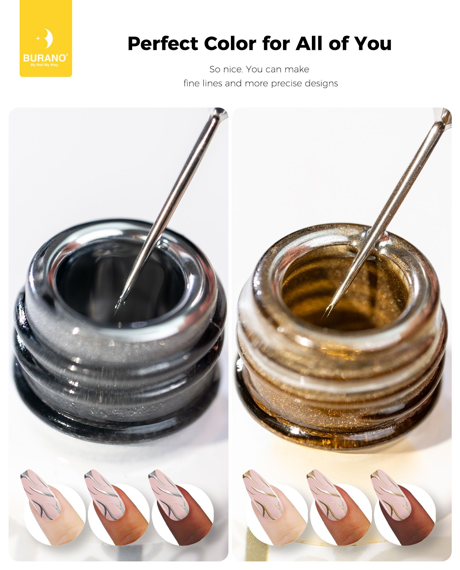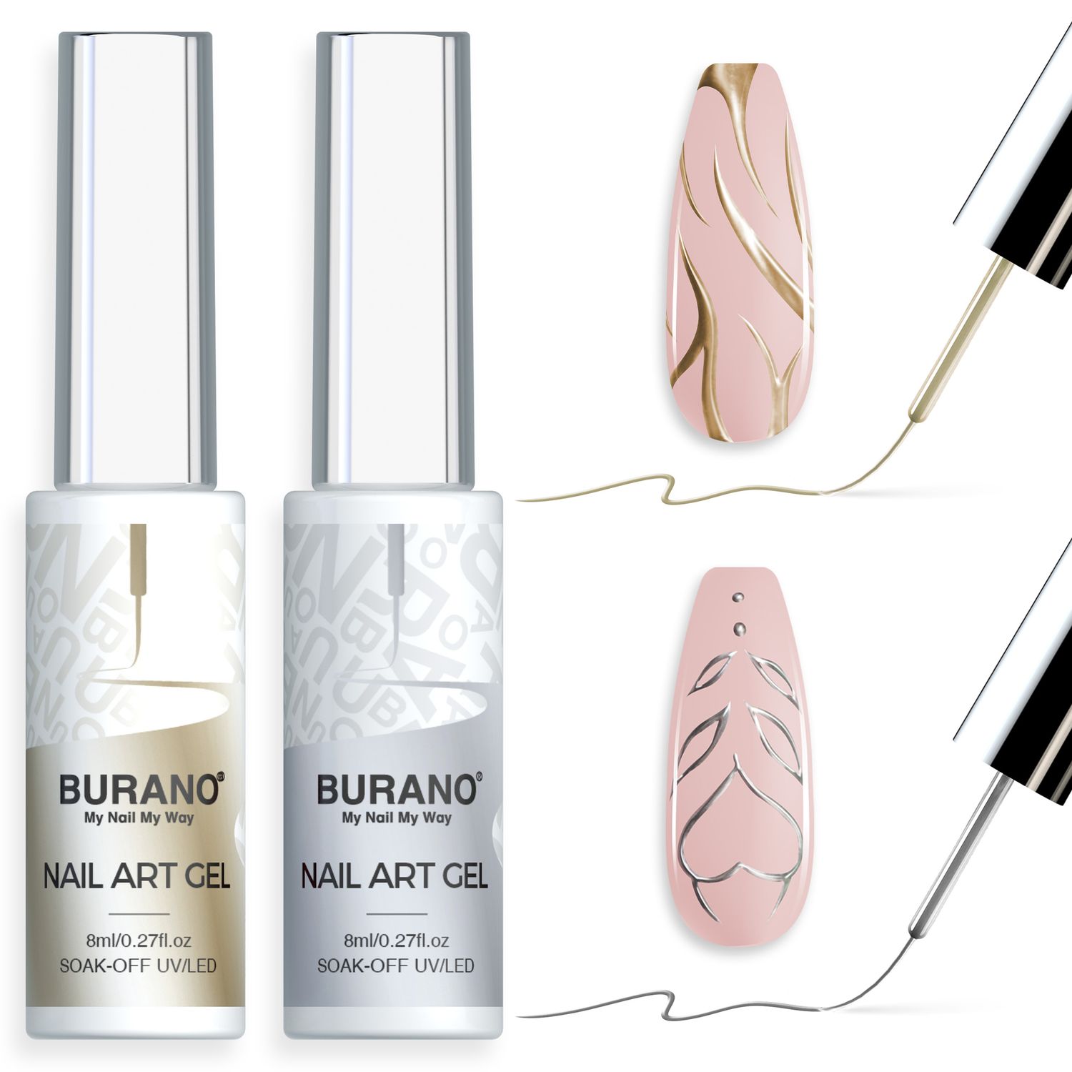 BURANO Silver Gold Metallic Gel Nail Polish Liner Nail Art Polish, 3D Painted Mirror Chrome Painted Gel Nail Design Polish 2 Bottle 8ml Chrome Gel Nail Polish Curing Required