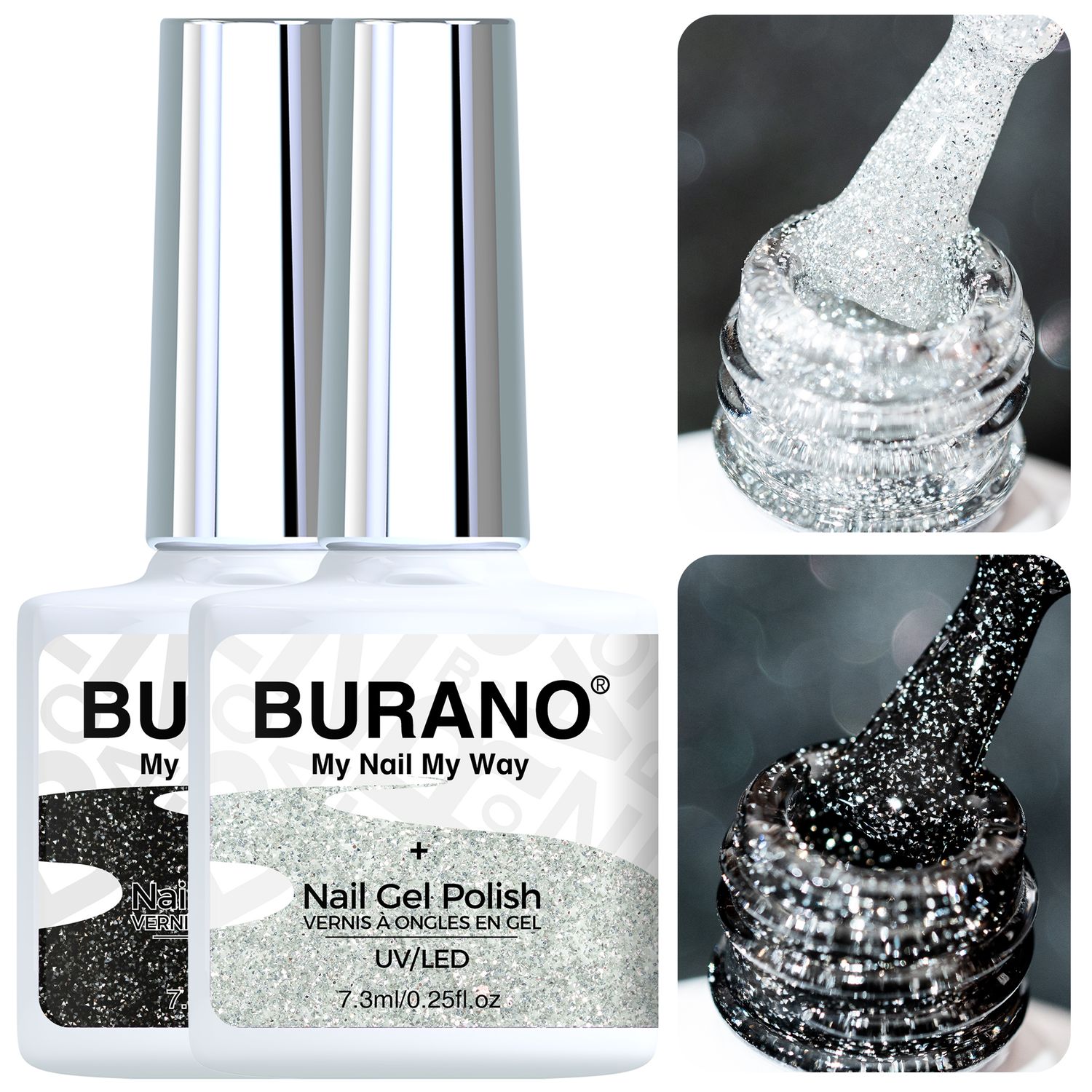 BURANO Reflective Glitter Gel Nail Polish, 2 Bottles UV Sparkle Nail Polish Silver Black Gel, 7.3ml Holographic Glitter Polish Curing Need for Nail Salon Home DIY S11 S15