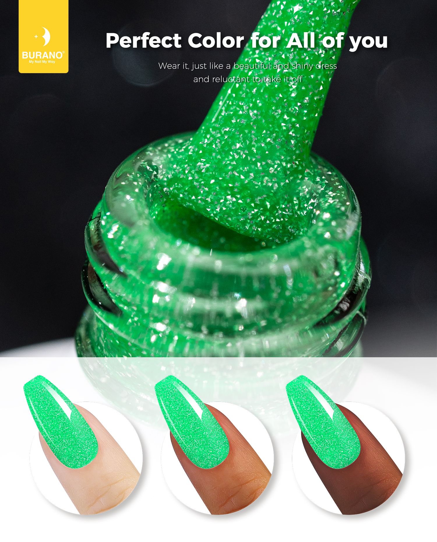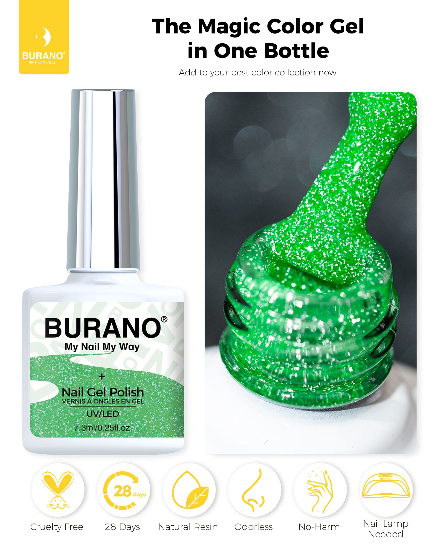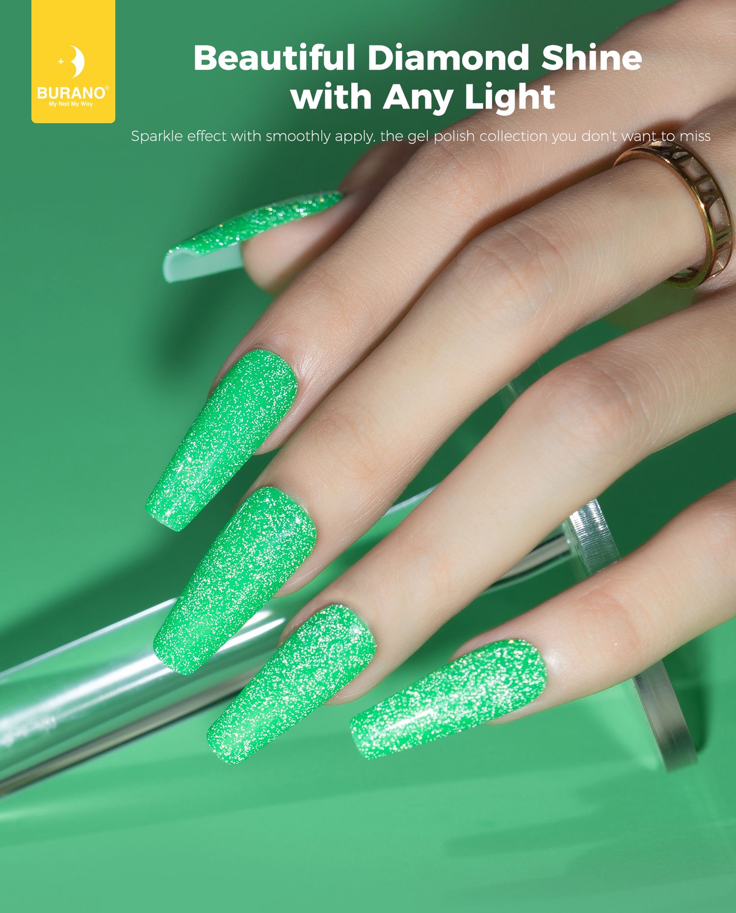 BURANO Green Reflective Glitter Gel Nail Polish, UV LED 7.3ml Sparkle Nail Polish Holographic Glitter Gel Curing Need for DIY Home S20