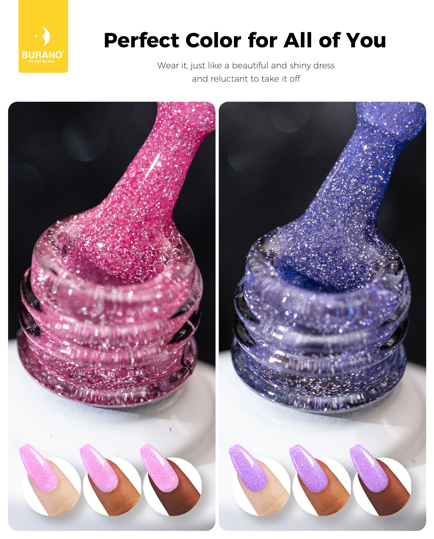BURANO Pink Reflective Glitter Gel Nail Polish, 2 Bottles UV Sparkle Nail Polish Purple Gel, 7.3ml Holographic Glitter Polish Curing Need for Nail Salon Home DIY S21 S9