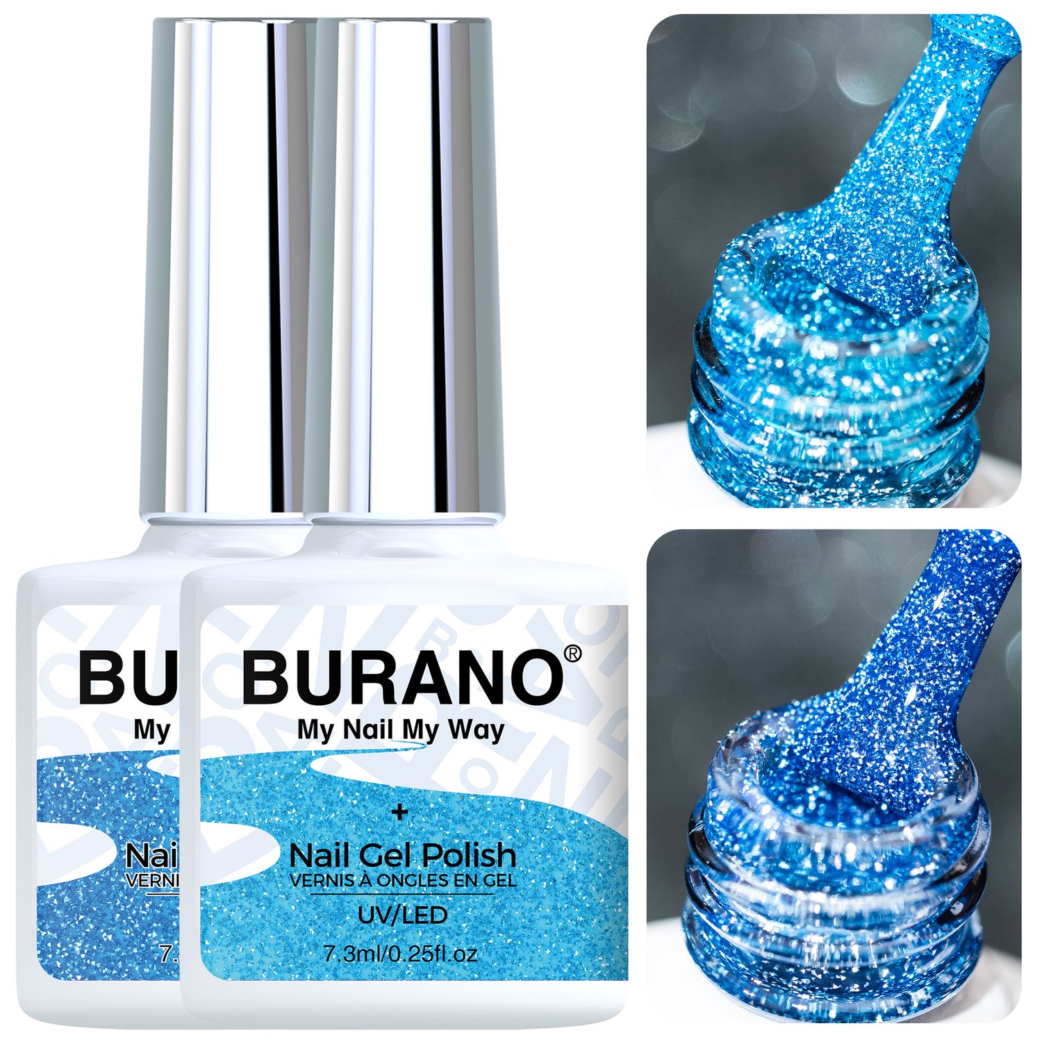 BURANO Blue Reflective Glitter Gel Nail Polish, 2 Bottles UV Sparkle Nail Polish Gel, 7.3ml Holographic Glitter Polish Curing Need for Nail Salon Home DIY S24 S23
