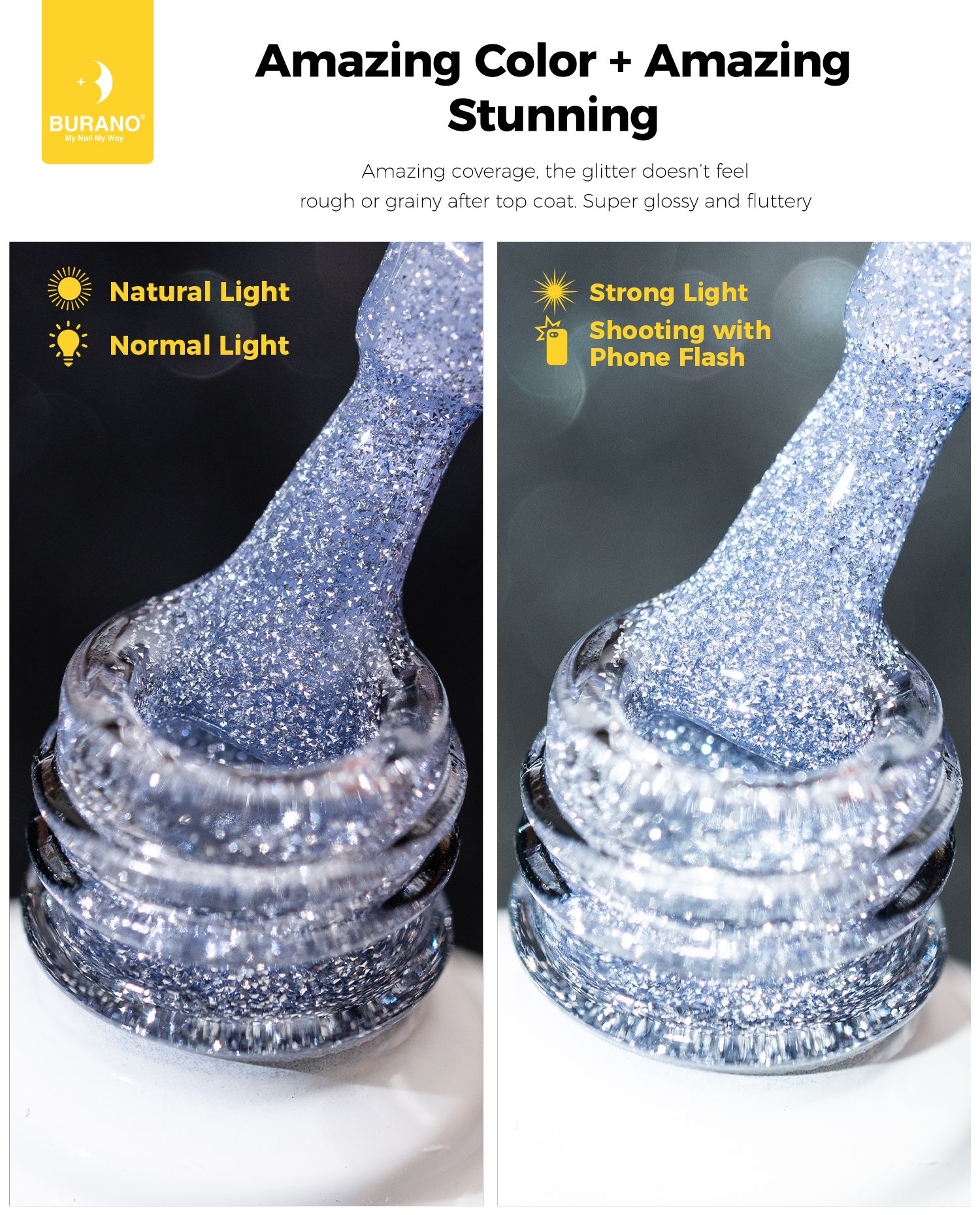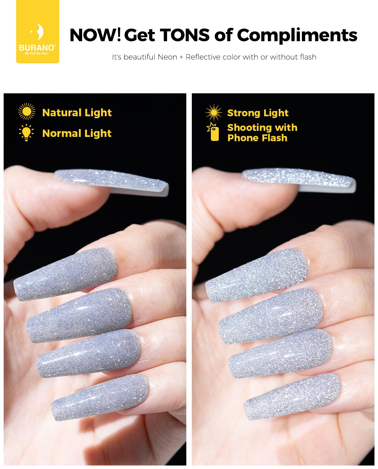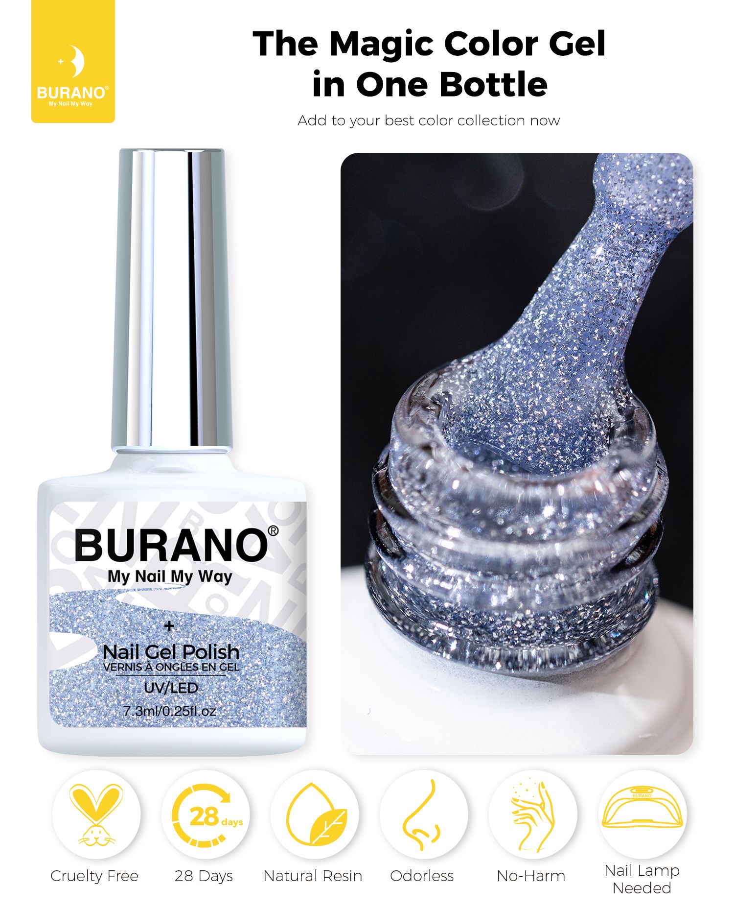 BURANO Silver Reflective Glitter Gel Nail Polish, UV LED 7.3ml Sparkle Nail Polish Holographic Glitter Gel Curing Need for DIY Home S27