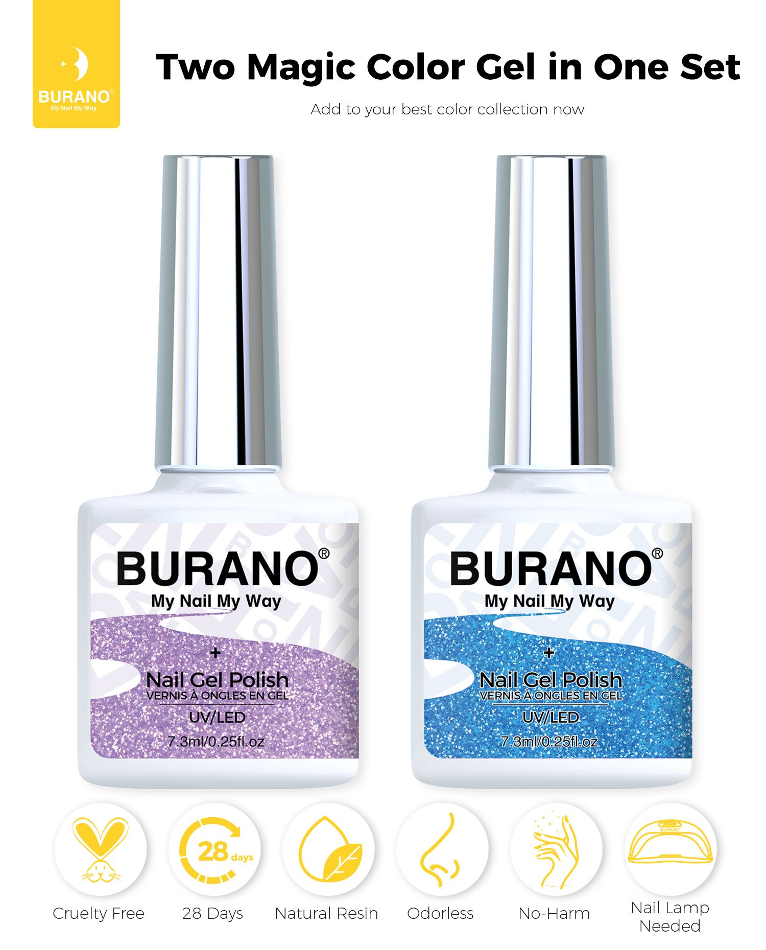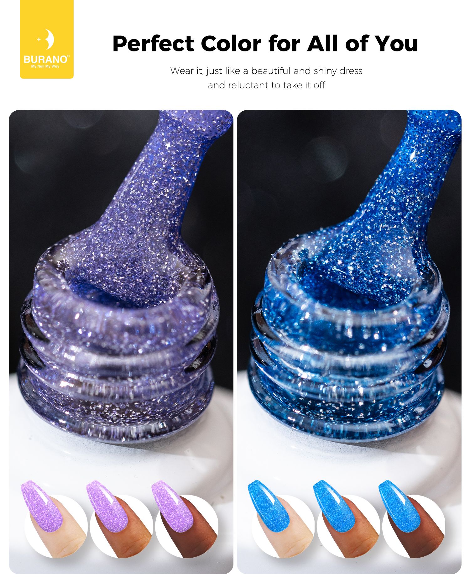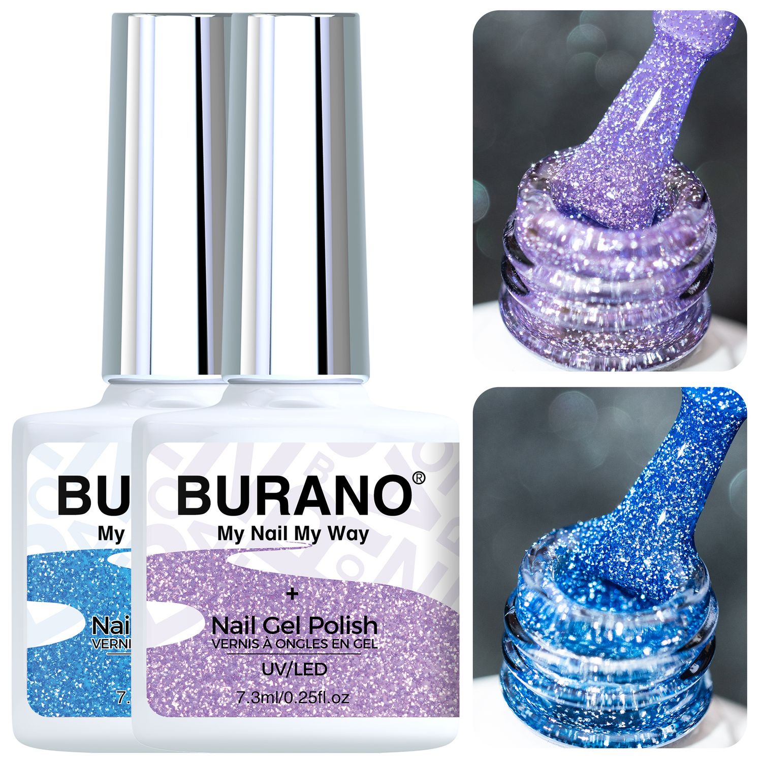 BURANO Reflective Glitter Gel Nail Polish, 2 Bottles UV Sparkle Nail Polish Purple Blue Gel, 7.3ml Holographic Glitter Polish Curing Need for Nail Salon Home DIY S9 S23